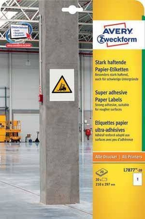 ETYKIETY PAPIEROWE 210X297MM OCHRONNE, ZABEZPIECZAJĄCE AVERY ZWECKFORM DO TRUDNYCH POWIERZCHNI L7877-20 BIAŁE 20ARK*1SZT